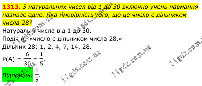 З натуральних чисел від 1 до 30 включно учень навмання називає одне. Яка ймовірність того, що це число є дільником числа 28? Натуральні числа від 1 до 30. Подія А: «число є дільником числа 28.» Дільник 28: 1, 2, 4, 7, 14, 28. Р(А) = 6/30 = 1/5. Відповідь: 1/5.