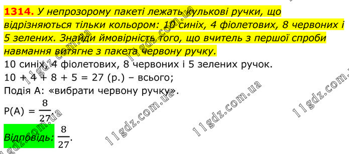 У непрозорому пакеті лежать кулькові ручки, що відрізняються тільки кольором: 10 синіх, 4 фіолетових, 8 червоних і 5 зелених. Знайди ймовірність того, що вчитель з першої спроби навмання витягне з пакета червону ручку. 10 синіх, 4 фіолетових, 8 червоних і 5 зелених ручок. 10 + 4 + 8 + 5 = 27 (р.) – всього; Подія А: «вибрати червону ручку». Р(А) = 8/27. Відповідь: 8/27.
