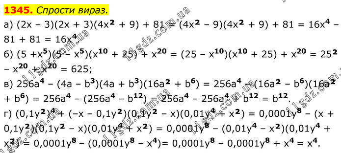 Спрости вираз. а) (2x – 3)(2x + 3)(4x² + 9) + 81 = (4x² – 9)(4x² + 9) + 81 = 16x4 – 81 + 81 = 16x4. б) (5 +x5)(5 – x5)(x10 + 25) + x20 = (25 – x10)(x10 + 25) + x20 = 25² – x20 + x20 = 625; в) 256а4 – (4a – b3)(4a + b3)(16а² + b6) = 256а4 – (16а² – b6)(16а² + b6) = 256а4 – (256а4 – b12) = 256а4 – 256а4 + b12 = b12. г) (0,1y²)4 + (–x – 0,1y²)(0,1y² – x)(0,01y4 + x²) = 0,0001y8 – (x + 0,1y²)(0,1y² – x)(0,01y4 + x²) = 0,0001y8 – (0,01y4 – x²)(0,01y4 + x²) = 0,0001y8 – (0,0001y8 – x4)= 0,0001y8 – 0,0001y8 + x4 = x4.