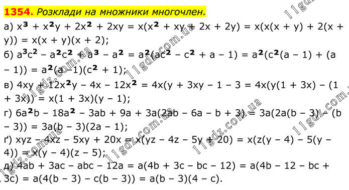 Розклади на множники многочлен. а) x³ + x²y + 2x² + 2xy = х(x² + ху + 2x + 2y) = х(х(х + y) + 2(x + y)) = x(x + y)(x + 2); б) а3с2 – а²c² + а³ – а² = а²(ac² – c² + а – 1) = a²(c²(a – 1) + (а – 1)) = а²(а –1)(c² + 1); в) 4xy + 12x²y – 4x – 12x² = 4x(y + 3xy – 1 – 3 = 4x(y(1 + 3х) – (1 + 3х)) = x(1 + 3х)(y – 1); г) 6а²b – 18а² – 3ab + 9а + 3а(2ab – 6а – b + 3) = 3a(2а(b – 3) – (b – 3)) = 3a(b – 3)(2а – 1); ґ) xyz – 4xz – 5xy + 20x = x(yz – 4z – 5y + 20) = x(z(y – 4) – 5(y – 4)) = х(у – 4)(z – 5); д) 4ab + 3ac – abc – 12a = a(4b + 3c – bc – 12) = а(4b – 12 – bc + 3c) = a(4(b – 3) – c(b – 3)) = a(b – 3)(4 – c).