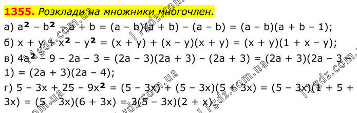 Розклади на множники многочлен. а) а² – b² – а + b = (a – b)(a + b) – (а – b) = (a – b)(a + b – 1); б) x + y + x² – y² = (x + y) + (x – y)(x + y) = (x + y)(1 + x – y); в) 4а² – 9 – 2а – 3 = (2a – 3)(2a + 3) – (2a + 3) = (2a + 3)(2a – 3 – 1) = (2a + 3)(2а – 4); г) 5 – 3х + 25 – 9x² = (5 – 3х) + (5 – 3х)(5 + 3х) = (5 – 3х)(1 + 5 + 3х) = (5 – 3х)(6 + 3х) = 3(5 – 3x)(2 + x).