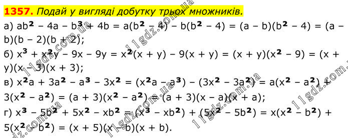 Подай у вигляді добутку трьох множників. а) ab² – 4a – b³ + 4b = a(b² – 4) – b(b² – 4) = (a – b)(b² – 4) = (a – b)(b – 2)(b + 2); б) x3 + x²y – 9x – 9y = x²(x + y) – 9(x + y) = (x + y)(x² – 9) = (x + y)(x – 3)(х + 3); в) x²a + 3a² – а³ – 3x² = (x²а – а³) – (3x² – 3а²) = a(x² – а²) + 3(x² – а²) = (a + 3)(x² – а²) = (a + 3)(х – а)(х + a); г) x³ – 5b² + 5x² – xb² = (x³ – xb²) + (5x² – 5b²) = x(x² – b²) + 5(x² – b²) = (x + 5)(x – b)(x + b).