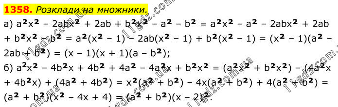 Розклади на множники. а) а²x² – 2abx² + 2ab + b²x² – а² – b² = а²x² – а² – 2abx² + 2ab + b²x² – b² = a²(x² – 1) – 2ab(x² – 1) + b²(x² – 1) = (x² – 1)(а² – 2ab + b²) = (x – 1)(x + 1)(a – b²); б) а2x² – 4b²x + 4b² + 4a² – 4а²x + b²x² = (а²x² + b²x²) – (4а²x + 4b²x) + (4а² + 4b²) = x²(a² + b²) – 4x(а² + b²) + 4(а² + b²) = (а² + b²)(x² – 4x + 4) = (а² + b²)(x – 2)².