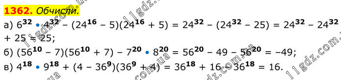 Обчисли. а) 632 • 432 – (2416 – 5)(2416 + 5) = 2432 – (2432 – 25) = 2432 – 2432 + 25 = 25; б) (5610 – 7)(5610 + 7) – 720 • 820 = 5620 – 49 – 5620 = –49; в) 418 • 918 + (4 – 369)(369 + 4) = 3618 + 16 – 3618 = 16.