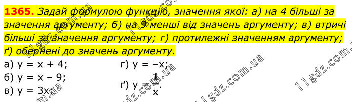 Задай формулою функцію, значення якої: а) на 4 більші за значення аргументу; б) на 9 менші від значень аргументу; в) втричі більші за значення аргументу; г) протилежні значенням аргументу; ґ) обернені до значень аргументу. а) y = x + 4; б) y = x – 9; в) y = 3х; г) y = –x; ґ) у = 1/х.