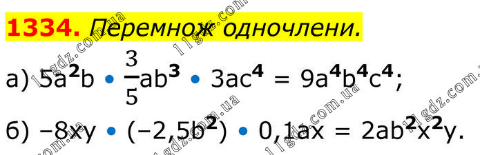 Перемнож одночлени. а) 5a2b • 3/5ab3 • 3ac4 = 9a4b4c4; б) –8xy • (–2,5b2) • 0,1ax = 2ab2x2y.