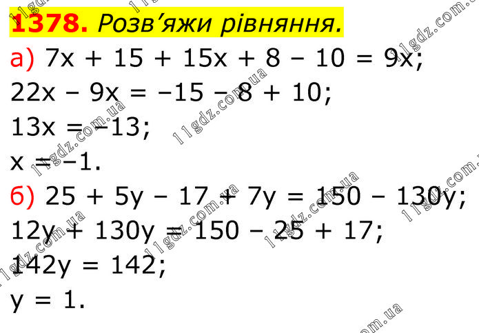 Розв’яжи рівняння. а) 7х + 15 + 15х + 8 – 10 = 9х; 22х – 9х = –15 – 8 + 10; 13х = –13; х = –1. б) 25 + 5у – 17 + 7у = 150 – 130у; 12у + 130у = 150 – 25 + 17; 142у = 142; у = 1.
