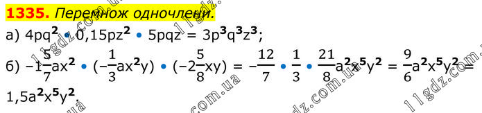 Перемнож одночлени. a) 4pq2 • 0,15pz2 • 5pqz = 3p3q3z3; б) –15/7ax2 • (–1/3ax2y) • (–25/8xy) = –12/7 • 1/3 • 21/8a2x5y2 = 9/6a2x5y2 = 1,5a2x5y2.