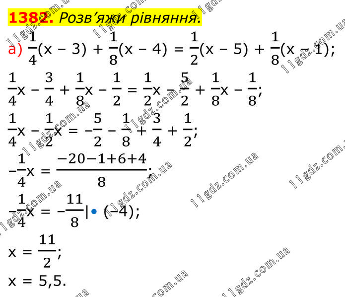 Розв’яжи рівняння. а) 1/4(х – 3) + 1/8(х – 4) = 1/2(х – 5) + 1/8(х – 1); 1/4х – 3/4 + 1/8х – 1/2 = 1/2х – 5/2 + 1/8х – 1/8; 1/4х – 1/2х = –5/2 – 1/8 + 3/4 + 1/2; –1/4х = (-20-1+6+4)/8; –1/4х = –11/8|• (–4); x = 11/2; x = 5,5.