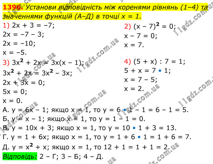 Установи відповідність між коренями рівнянь (1–4) та значеннями функцій (А–Д) в точці x = 1. 1) 2х + 3 = –7; 2х = –7 – 3; 2х = –10; х = –5. 2) (х – 7)2 = 0; х – 7 = 0; х = 7. 3) 3х2 + 2х = 3х(х – 1); 3х2 + 2х = 3х2 – 3х; 2х + 3х = 0; 5х = 0; х = 0. 4) (5 + х) : 7 = 1; 5 + х = 7 • 1; х = 7 – 5; х = 2. А. у = 6х – 1; якщо х = 1, то у = 6 • 1 – 1 = 6 – 1 = 5. Б. у = х – 1; якщо х = 1, то у = 1 – 1 = 0. В. у = 10х + 3; якщо х = 1, то у = 10 • 1 + 3 = 13. Г. у = 1 + 6х; якщо х = 1, то у = 1 + 6 • 1 = 1 + 6 = 7. Д. у = х2 + х; якщо х = 1, то 12 + 1 = 1 + 1 = 2. Відповідь: 2 – Г; 3 – Б; 4 – Д.
