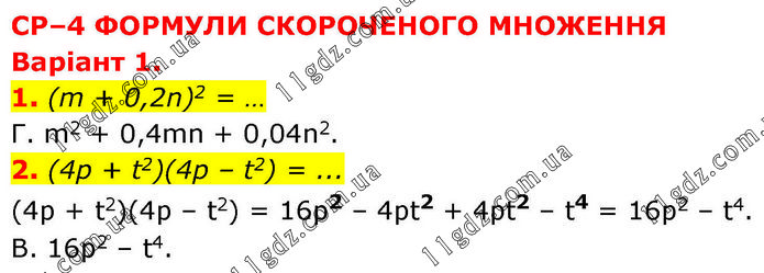 СР–4 ФОРМУЛИ СКОРОЧЕНОГО МНОЖЕННЯ Варіант 1. 1. (m + 0,2n)2 = … Г. m2 + 0,4mn + 0,04n2. 2. (4p + t2)(4p – t2) = ... (4p + t2)(4p – t2) = 16р2 – 4pt2 + 4pt2 – t4 = 16p2 – t4. В. 16p2 – t4.