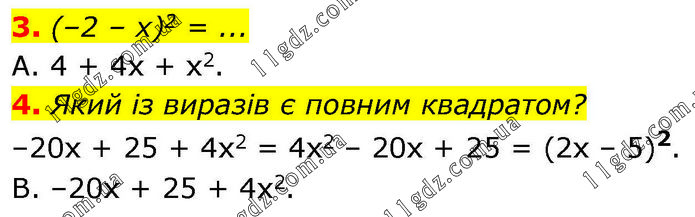 3. (–2 – х)2 = ... А. 4 + 4х + х2. 4. Який із виразів є повним квадратом? –20x + 25 + 4х2 = 4х2 – 20x + 25 = (2х – 5)2. В. –20x + 25 + 4х2.