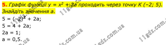 Графік функції у = х2 + 2а проходить через точку К (–2; 5). Знайдіть значення а. 5 = (–2)2 + 2а; 5 = 4 + 2а; 2а = 1; а = 0,5.