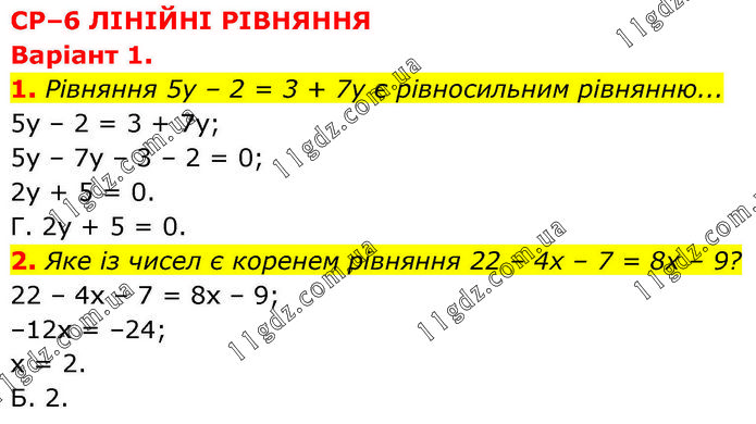 СР–6 ЛІНІЙНІ РІВНЯННЯ Варіант 1. 1. Рівняння 5у – 2 = 3 + 7у є рівносильним рівнянню... 5у – 2 = 3 + 7у; 5у – 7у – 3 – 2 = 0; 2у + 5 = 0. Г. 2у + 5 = 0. 2. Яке із чисел є коренем рівняння 22 – 4х – 7 = 8х – 9? 22 – 4х – 7 = 8х – 9; –12х = –24; х = 2. Б. 2.