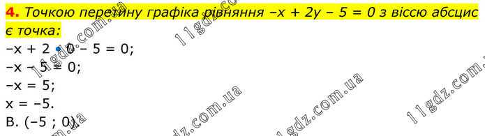 Точкою перетину графіка рівняння –х + 2у – 5 = 0 з віссю абсцис є точка: –х + 2 • 0 – 5 = 0; –х – 5 = 0; –х = 5; х = –5. В. (–5 ; 0).