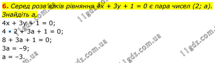 Серед розв’язків рівняння 4х + 3y + 1 = 0 є пара чисел (2; а). Знайдіть а. 4х + 3y + 1 = 0; 4 • 2 + 3а + 1 = 0; 8 + 3а + 1 = 0; 3а = –9; а = –3.