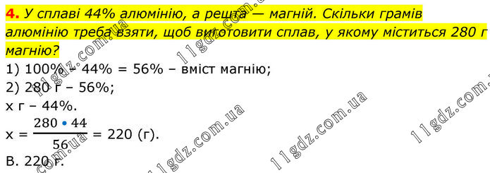 У сплаві 44% алюмінію, а решта — магній. Скільки грамів алюмінію треба взяти, щоб виготовити сплав, у якому міститься 280 г магнію? 1) 100% – 44% = 56% – вміст магнію; 2) 280 г – 56%; х г – 44%. х = (280 • 44)/56 = 220 (г). В. 220 г.