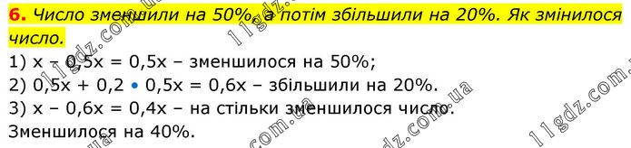 Число зменшили на 50%, а потім збільшили на 20%. Як змінилося число. 1) х – 0,5х = 0,5х – зменшилося на 50%; 2) 0,5х + 0,2 • 0,5х = 0,6х – збільшили на 20%. 3) х – 0,6х = 0,4х – на стільки зменшилося число. Зменшилося на 40%.