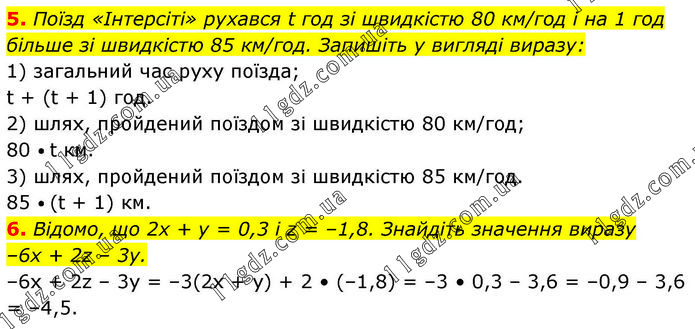 5. Поїзд «Інтерсіті» рухався t год зі швидкістю 80 км/год і на 1 год більше зі швидкістю 85 км/год. Запишіть у вигляді виразу: 1) загальний час руху поїзда; t + (t + 1) год. 2) шлях, пройдений поїздом зі швидкістю 80 км/год; 80 • t км. 3) шлях, пройдений поїздом зі швидкістю 85 км/год. 85 • (t + 1) км. 6. Відомо, що 2х + у = 0,3 і z = –1,8. Знайдіть значення виразу –6x + 2z – 3у. –6х + 2z – 3y = –3(2x + y) + 2 • (–1,8) = –3 • 0,3 – 3,6 = –0,9 – 3,6 = –4,5.