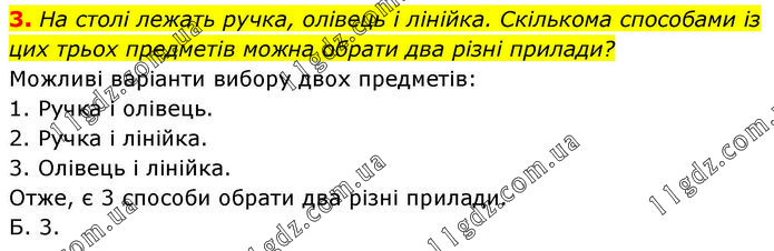 На столі лежать ручка, олівець і лінійка. Скількома способами із цих трьох предметів можна обрати два різні прилади? Можливі варіанти вибору двох предметів: 1. Ручка і олівець. 2. Ручка і лінійка. 3. Олівець і лінійка. Отже, є 3 способи обрати два різні прилади. Б. 3.