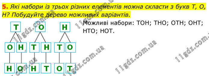 Які набори із трьох різних елементів можна скласти з букв Т, О, Н? Побудуйте дерево можливих варіантів. Можливі набори: ТОН; ТНО; ОТН; ОНТ; НТО; НОТ.