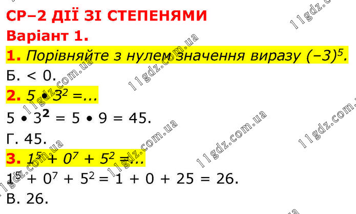 СР–2 ДІЇ ЗІ СТЕПЕНЯМИ Варіант 1. 1. Порівняйте з нулем значення виразу (–3)5. Б. < 0. 2. 5 • З2 =... 5 • 32 = 5 • 9 = 45. Г. 45. 3. 15 + 07 + 52 =... 15 + 07 + 52 = 1 + 0 + 25 = 26. В. 26.