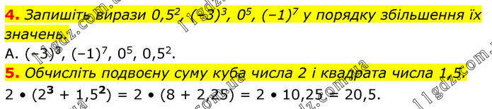 4. Запишіть вирази 0,52, (–3)3, 05, (–1)7 у порядку збільшення їх значень. А. (–3)3, (–1)7, 05, 0,52. 5. Обчисліть подвоєну суму куба числа 2 і квадрата числа 1,5. 2 • (23 + 1,52) = 2 • (8 + 2,25) = 2 • 10,25 = 20,5.