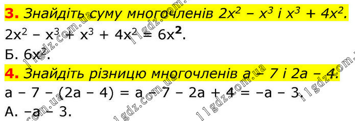 3. Знайдіть суму многочленів 2х2 – х3 і х3 + 4х2. 2х2 – х3 + х3 + 4х2 = 6х2. Б. 6x2. 4. Знайдіть різницю многочленів а – 7 і 2а – 4. а – 7 – (2а – 4) = а – 7 – 2а + 4 = –а – 3. А. –а – 3.