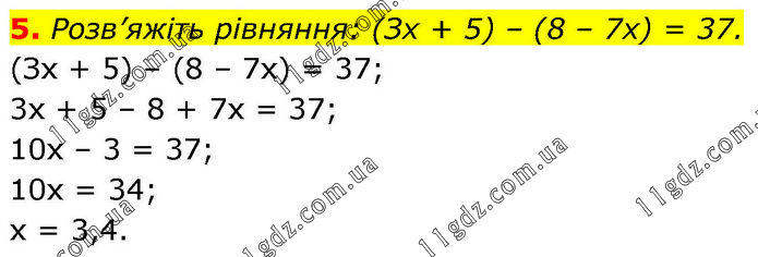 5. Розв’яжіть рівняння: (Зх + 5) – (8 – 7х) = 37. (Зх + 5) – (8 – 7х) = 37; 3х + 5 – 8 + 7х = 37; 10х – 3 = 37; 10х = 34; х = 3,4.