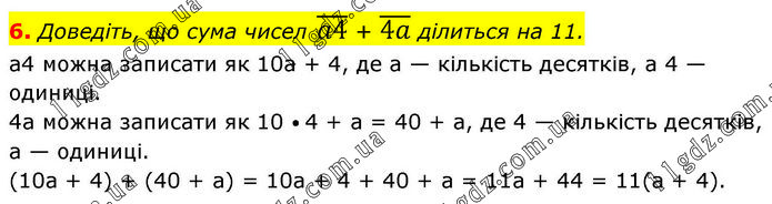 6. Доведіть, що сума чисел (a4) ̅ + (4a) ̅ ділиться на 11. a4 можна записати як 10a + 4, де a — кількість десятків, а 4 — одиниці. 4a можна записати як 10 • 4 + a = 40 + a, де 4 — кількість десятків, a — одиниці. (10a + 4) + (40 + a) = 10a + 4 + 40 + a = 11a + 44 = 11(a + 4).