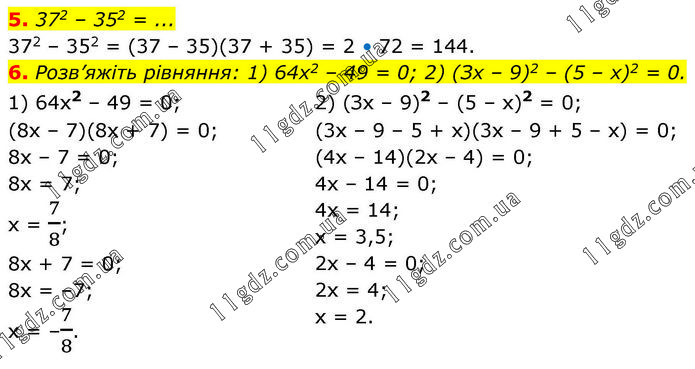 5. 372 – 352 = ... 372 – 352 = (37 – 35)(37 + 35) = 2 • 72 = 144. 6. Розв’яжіть рівняння: 1) 64x2 – 49 = 0; 2) (Зх – 9)2 – (5 – x)2 = 0. 1) 64x2 – 49 = 0; (8х – 7)(8х + 7) = 0; 8х – 7 = 0; 8х = 7; х = 7/8; 8х + 7 = 0; 8х = –7; х = –7/8. 2) (Зх – 9)2 – (5 – x)2 = 0; (3х – 9 – 5 + х)(3х – 9 + 5 – х) = 0; (4х – 14)(2х – 4) = 0; 4х – 14 = 0; 4х = 14; х = 3,5; 2х – 4 = 0; 2х = 4; х = 2.