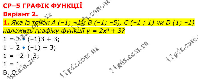 СР–5 ГРАФІК ФУНКЦІЇ Варіант 2. 1. Яка із точок A (–1; –1), В (–1; –5), C (–1 ; 1) чи D (1; –1) належить графіку функції у = 2х3 + З? 1 = 2 • (–1)3 + 3; 1 = 2 • (–1) + 3; 1 = –2 + 3; 1 = 1. B. C.