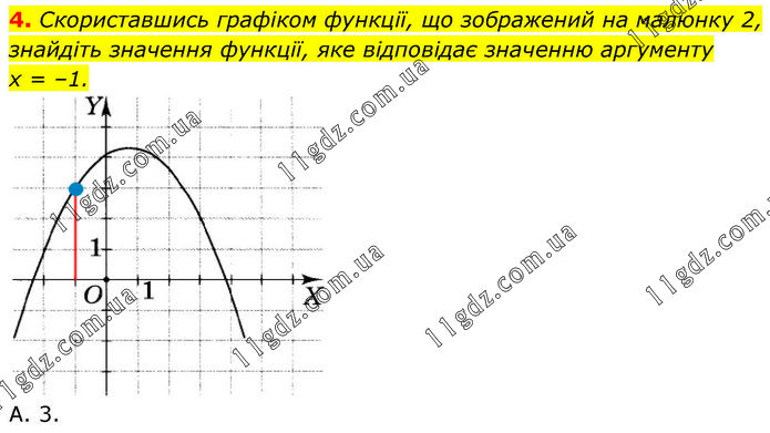 Скориставшись графіком функції, що зображений на малюнку 2, знайдіть значення функції, яке відповідає значенню аргументу х = –1. А. 3.