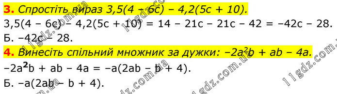 3. Спростіть вираз 3,5(4 – 6с) – 4,2(5с + 10). 3,5(4 – 6с) – 4,2(5с + 10) = 14 – 21с – 21с – 42 = –42с – 28. Б. –42с – 28. 4. Винесіть спільний множник за дужки: –2а2b + аb – 4а. –2а2b + ab – 4a = –a(2ab – b + 4). Б. –а(2аb – b + 4).