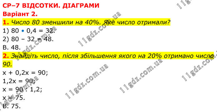 СР–7 ВІДСОТКИ. ДІАГРАМИ Варіант 2. 1. Число 80 зменшили на 40%. Яке число отримали? 1) 80 • 0,4 = 32. 2) 80 – 32 = 48. В. 48. 2. Знайдіть число, після збільшення якого на 20% отримано число 90. х + 0,2х = 90; 1,2х = 90; х = 90 : 1,2; х = 75. В. 75.
