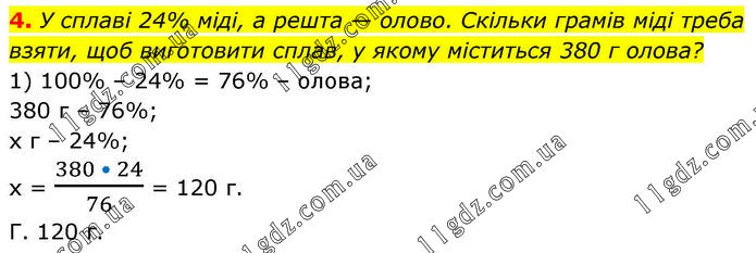 У сплаві 24% міді, а решта — олово. Скільки грамів міді треба взяти, щоб виготовити сплав, у якому міститься 380 г олова? 1) 100% – 24% = 76% – олова; 380 г – 76%; х г – 24%; х = (380 • 24)/76 = 120 г. Г. 120 г.