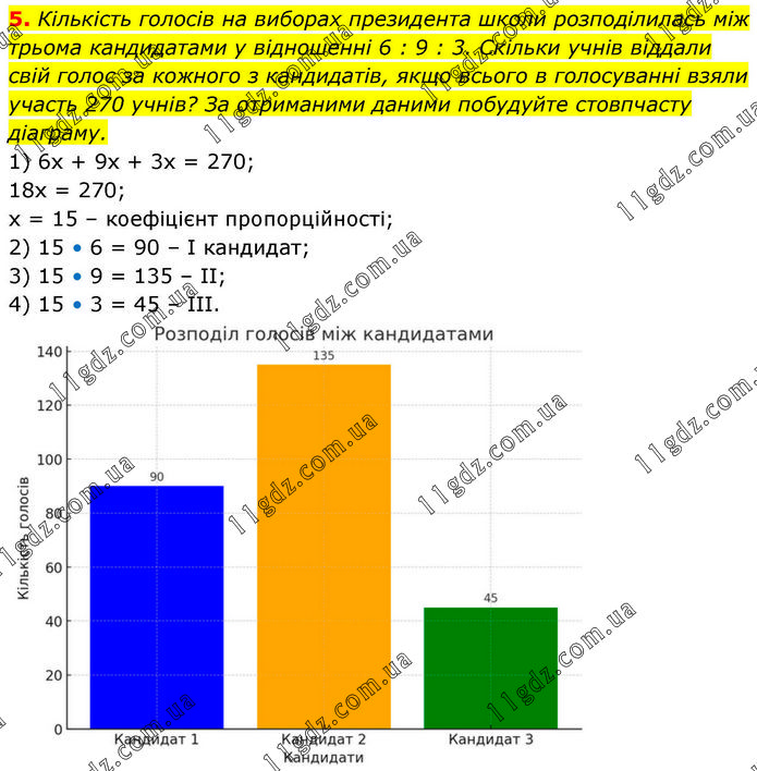 Кількість голосів на виборах президента школи розподілилась між трьома кандидатами у відношенні 6 : 9 : 3. Скільки учнів віддали свій голос за кожного з кандидатів, якщо всього в голосуванні взяли участь 270 учнів? За отриманими даними побудуйте стовпчасту діаграму. 1) 6х + 9х + 3х = 270; 18х = 270; х = 15 – коефіцієнт пропорційності; 2) 15 • 6 = 90 – І кандидат; 3) 15 • 9 = 135 – ІІ; 4) 15 • 3 = 45 – ІІІ.