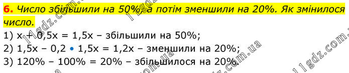 Число збільшили на 50%, а потім зменшили на 20%. Як змінилося число. 1) х + 0,5х = 1,5х – збільшили на 50%; 2) 1,5х – 0,2 • 1,5х = 1,2х – зменшили на 20%; 3) 120% – 100% = 20% – збільшилося на 20%.