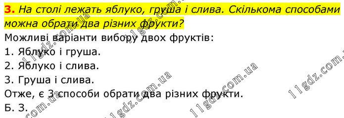На столі лежать яблуко, груша і слива. Скількома способами можна обрати два різних фрукти? Можливі варіанти вибору двох фруктів: 1. Яблуко і груша. 2. Яблуко і слива. 3. Груша і слива. Отже, є 3 способи обрати два різних фрукти. Б. З.