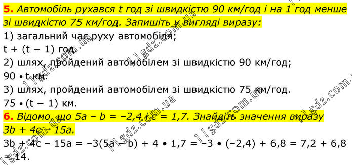 5. Автомобіль рухався t год зі швидкістю 90 км/год і на 1 год менше зі швидкістю 75 км/год. Запишіть у вигляді виразу: 1) загальний час руху автомобіля; t + (t − 1) год. 2) шлях, пройдений автомобілем зі швидкістю 90 км/год; 90 • t км. 3) шлях, пройдений автомобілем зі швидкістю 75 км/год. 75 • (t − 1) км. 6. Відомо, що 5а – b = –2,4 і с = 1,7. Знайдіть значення виразу Зb + 4с – 15а. Зb + 4с – 15а = –3(5a – b) + 4 • 1,7 = –3 • (–2,4) + 6,8 = 7,2 + 6,8 = 14.