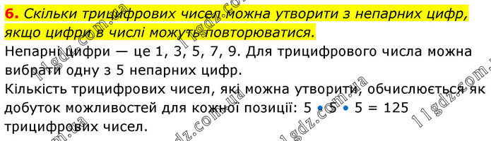 Скільки трицифрових чисел можна утворити з непарних цифр, якщо цифри в числі можуть повторюватися. Непарні цифри — це 1, 3, 5, 7, 9. Для трицифрового числа можна вибрати одну з 5 непарних цифр. Кількість трицифрових чисел, які можна утворити, обчислюється як добуток можливостей для кожної позиції: 5 • 5 • 5 = 125 трицифрових чисел.