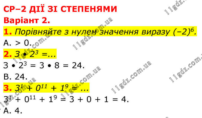 СР–2 ДІЇ ЗІ СТЕПЕНЯМИ Варіант 2. 1. Порівняйте з нулем значення виразу (–2)6. А. > 0. 2. З • 23 =... З • 23 = 3 • 8 = 24. В. 24. 3. 31 + 011 + 19 = ... 31 + 011 + 19 = 3 + 0 + 1 = 4. А. 4.