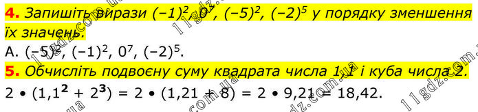 4. Запишіть вирази (–1)2, 07, (–5)2, (–2)5 у порядку зменшення їх значень. А. (–5)2, (–1)2, 07, (–2)5. 5. Обчисліть подвоєну суму квадрата числа 1,1 і куба числа 2. 2 • (1,12 + 23) = 2 • (1,21 + 8) = 2 • 9,21 = 18,42.