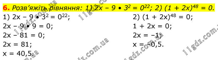Розв’яжіть рівняння: 1) 2х – 9 • 32 = 022; 2) (1 + 2х)48 = 0. 1) 2х – 9 • 32 = 022; 2х – 9 • 9 = 0; 2х – 81 = 0; 2х = 81; х = 40,5. 2) (1 + 2х)48 = 0; 1 + 2х = 0; 2х = –1; х = –0,5.