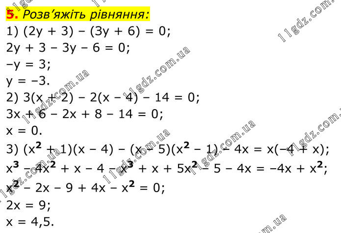 Розв’яжіть рівняння: 1) (2y + 3) – (Зу + 6) = 0; 2у + 3 – 3у – 6 = 0; –у = 3; у = –3. 2) 3(х + 2) – 2(х – 4) – 14 = 0; 3х + 6 – 2х + 8 – 14 = 0; х = 0. 3) (х2 + 1)(х – 4) – (х – 5)(х2 – 1) – 4х = х(–4 + х); х3 – 4х2 + х – 4 – х3 + х + 5х2 – 5 – 4х = –4х + х2; х2 – 2х – 9 + 4х – х2 = 0; 2х = 9; х = 4,5.