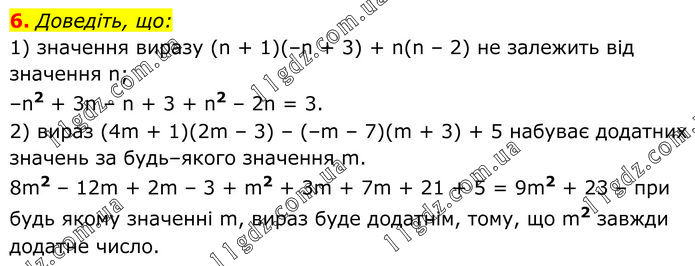 Доведіть, що: 1) значення виразу (n + 1)(–n + 3) + n(n – 2) не залежить від значення n; –n2 + 3n – n + 3 + n2 – 2n = 3. 2) вираз (4m + 1)(2m – 3) – (–m – 7)(m + 3) + 5 набуває додатних значень за будь–якого значення m. 8m2 – 12m + 2m – 3 + m2 + 3m + 7m + 21 + 5 = 9m2 + 23 – при будь якому значенні m, вираз буде додатнім, тому, що m2 завжди додатне число.