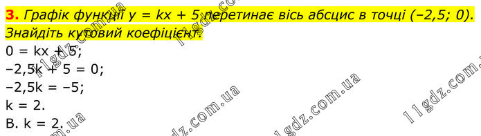 Графік функції у = kx + 5 перетинає вісь абсцис в точці (–2,5; 0). Знайдіть кутовий коефіцієнт. 0 = kx + 5; –2,5k + 5 = 0; –2,5k = –5; k = 2. В. k = 2.