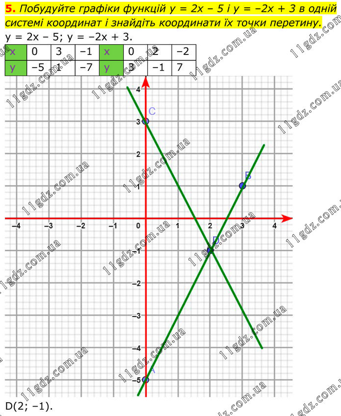 Побудуйте графіки функцій у = 2х – 5 і у = –2х + 3 в одній системі координат і знайдіть координати їх точки перетину. D(2; –1).