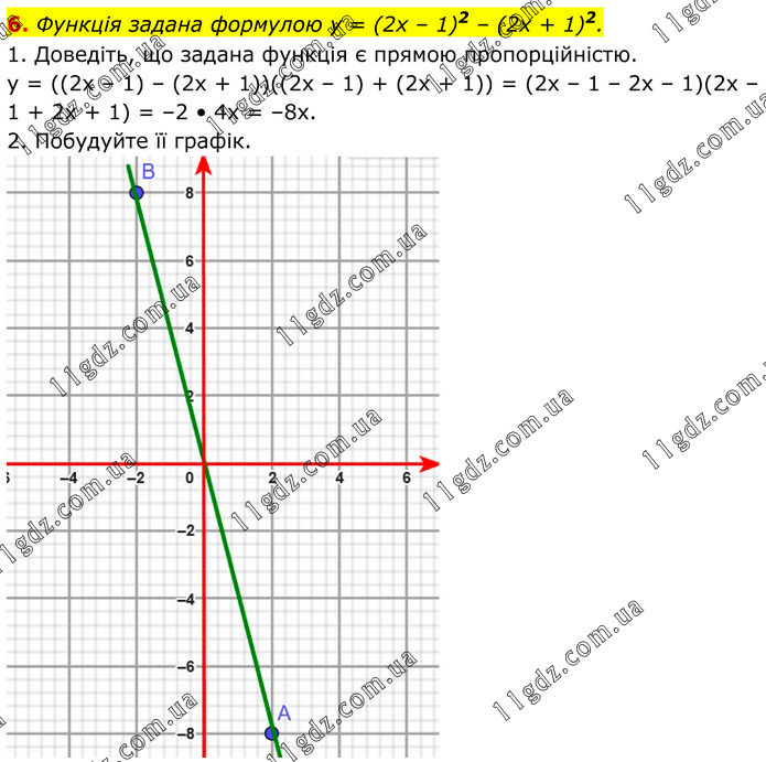 Функція задана формулою у = (2х – 1)2 – (2х + 1)2. 1. Доведіть, що задана функція є прямою пропорційністю. у = ((2х – 1) – (2х + 1))((2х – 1) + (2х + 1)) = (2х – 1 – 2х – 1)(2х – 1 + 2х + 1) = –2 • 4х = –8х. 2. Побудуйте її графік.