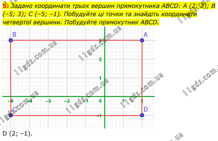 Задано координати трьох вершин прямокутника ABCD: А (2; 3); В (–5; 3); C (–5; –1). Побудуйте ці точки та знайдіть координати четвертої вершини. Побудуйте прямокутник ABCD. D (2; –1).